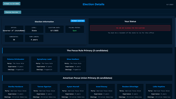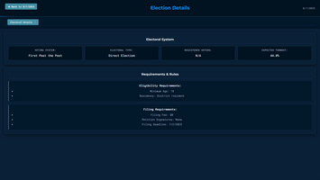 - The elections tab UI has received a massive overhaul. It is now much easier to navigate and understand. It uses a calendar system for listing elections, and the elections results are better UI wise but they aren't quite done yet.