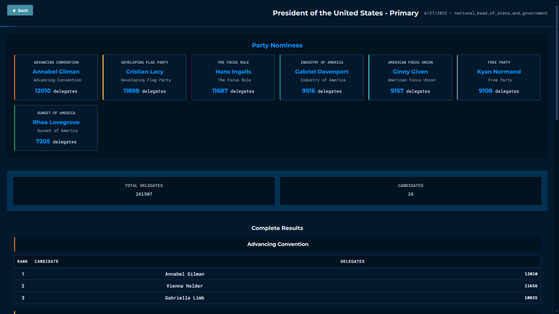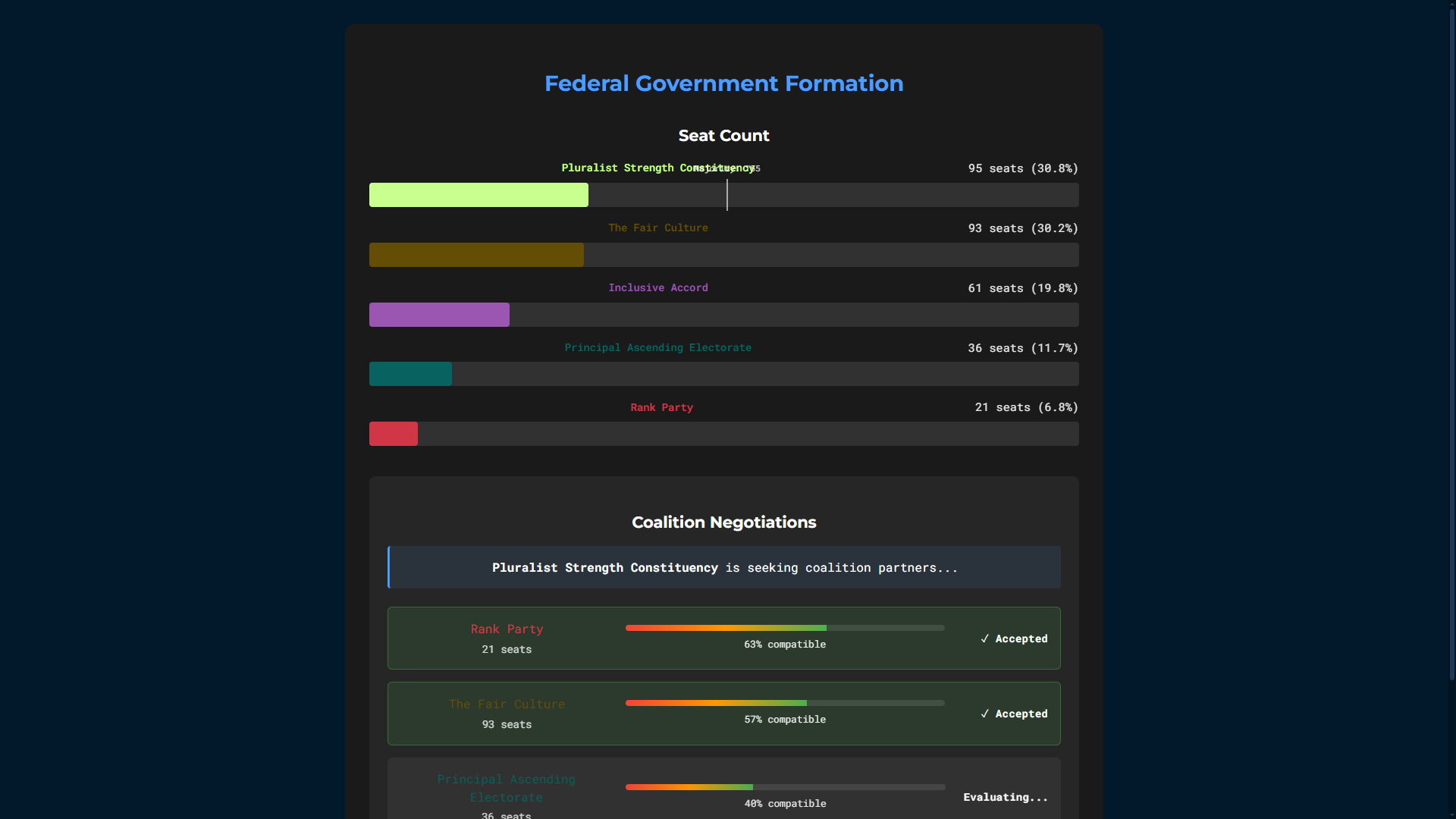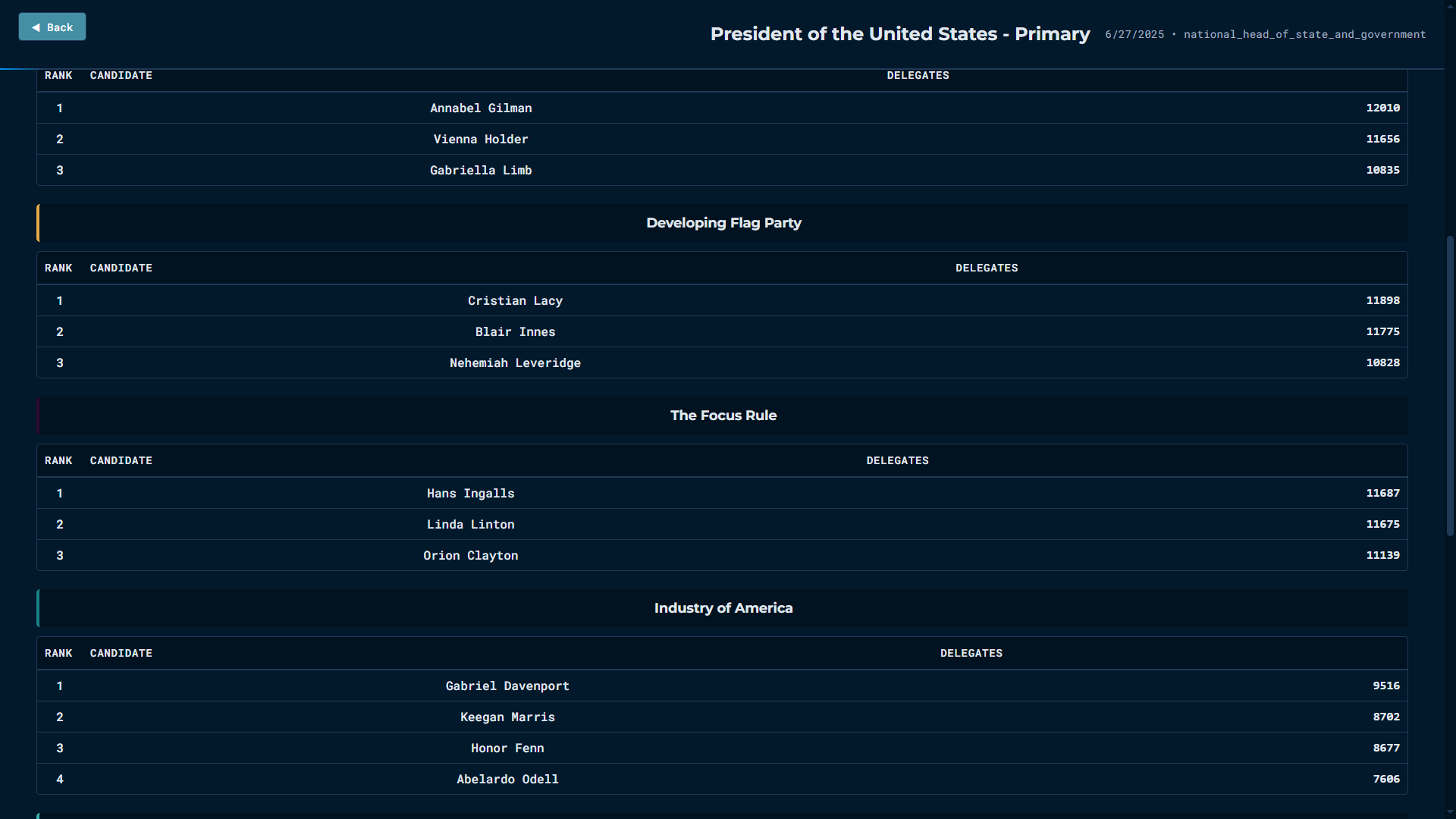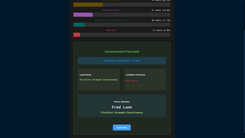 - Election results and history are currently not saved. This will be changed of course and also added to the government offices for election history of a seat.