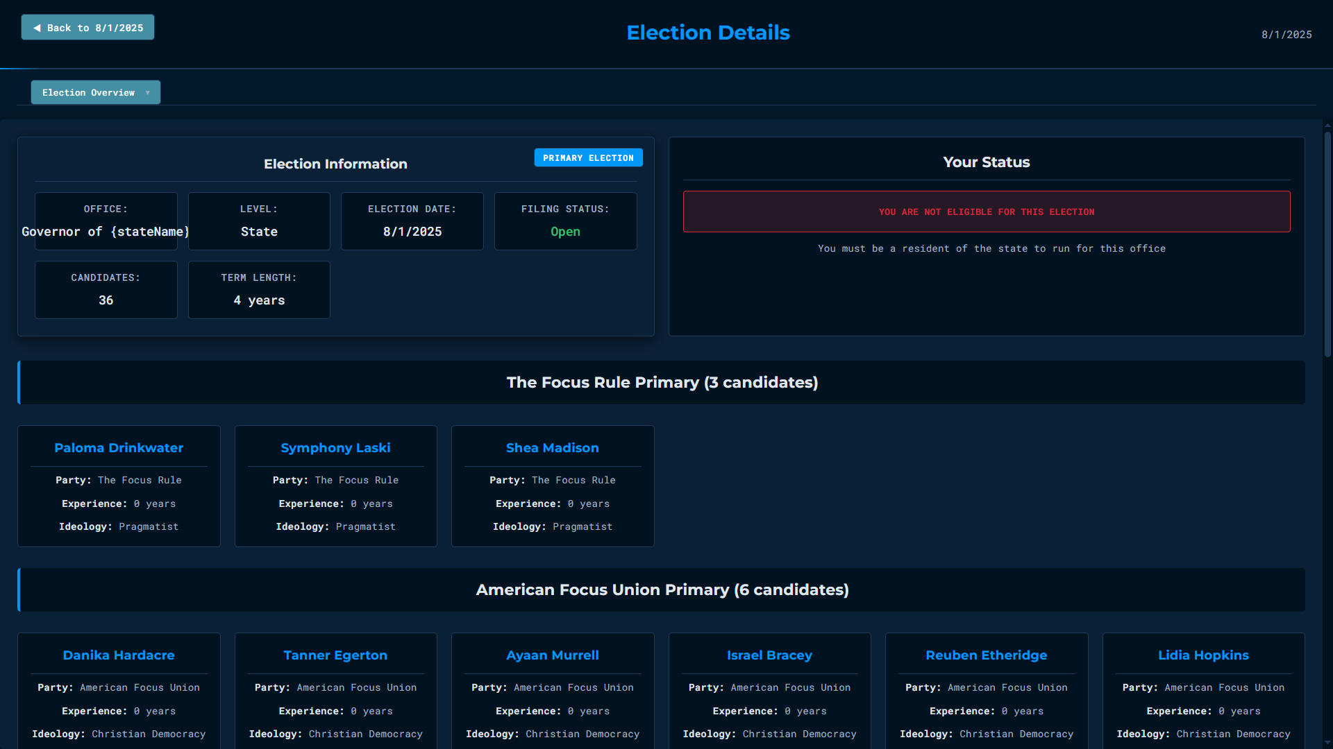- Election history is almost implemented, but for now it is not quite there yet. You can view recent elections in the elections history tab in the elections tab.