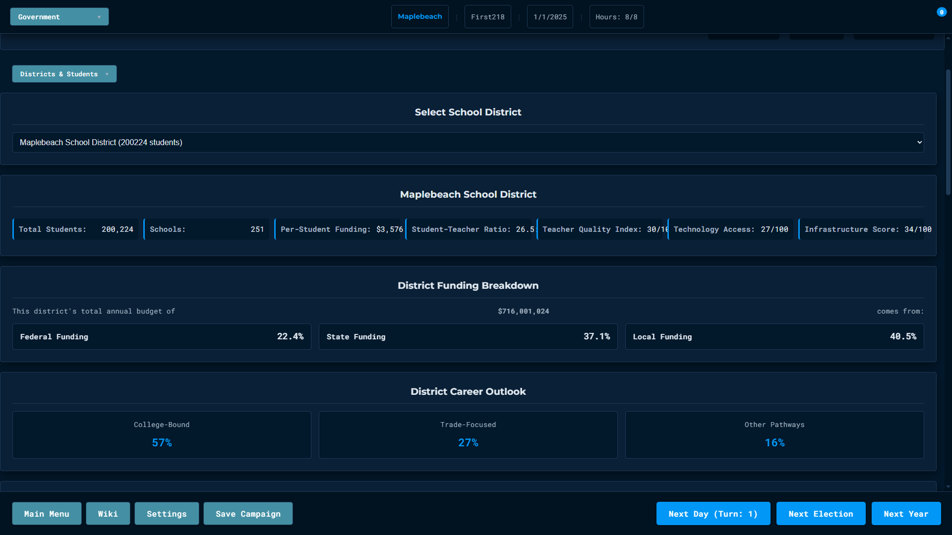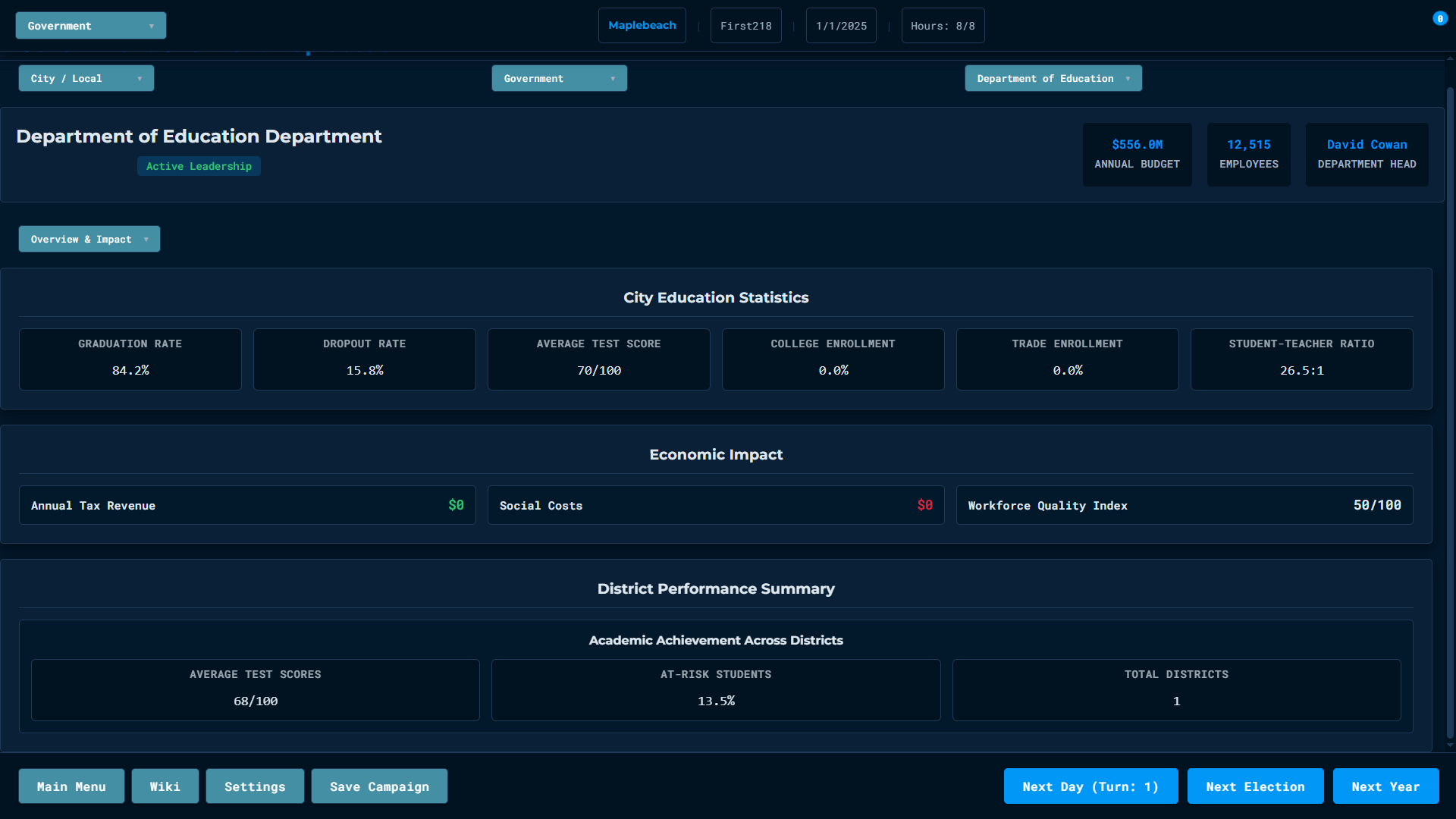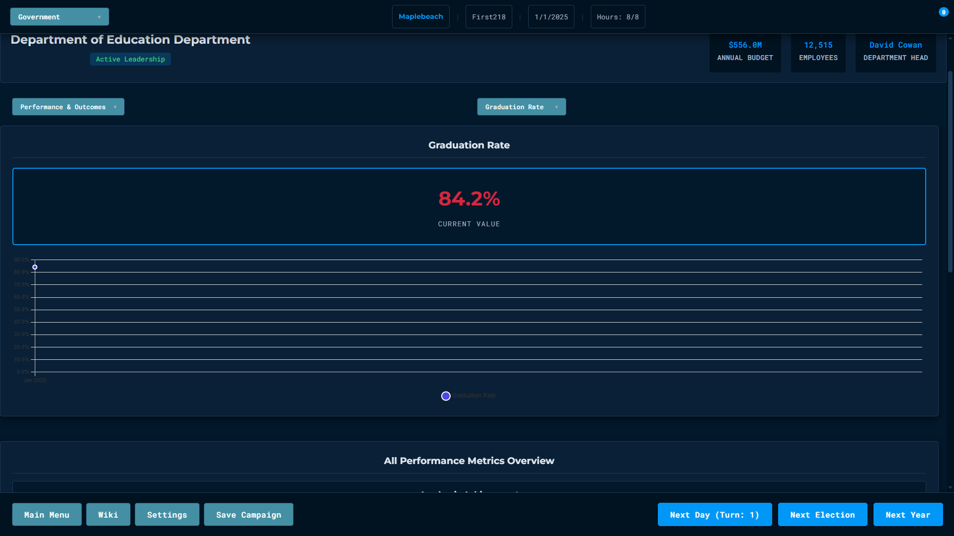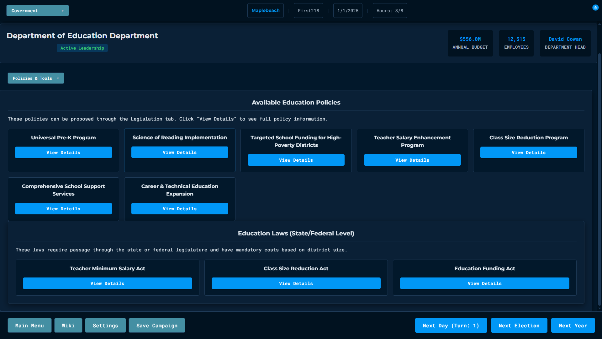 - New laws and policies have been introduced. Judicial, education, infrastructure, healthcare, and housing I believe. Along with other laws. Many of these laws are not completely functional yet and may show incorrect effects data like the minimum wage currently showing a huge increase in unemployment.